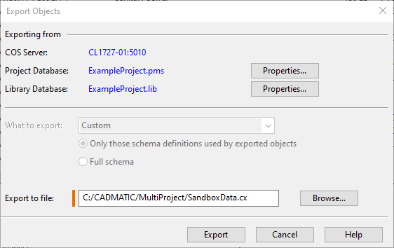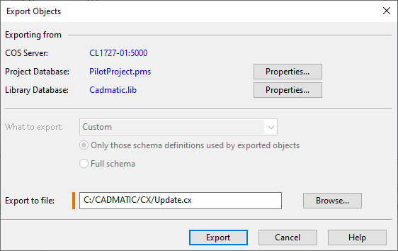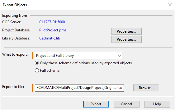 Note: In this example, the library database is "Cadmatic.lib", the project database is "PilotProject.pms", and we export their data to DesignProject_Original.cx.