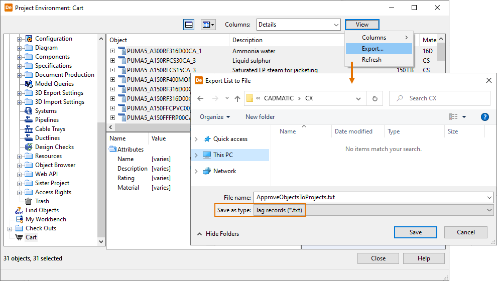 Note: In this example, we export the records to ApproveObjectsToProjects.txt.