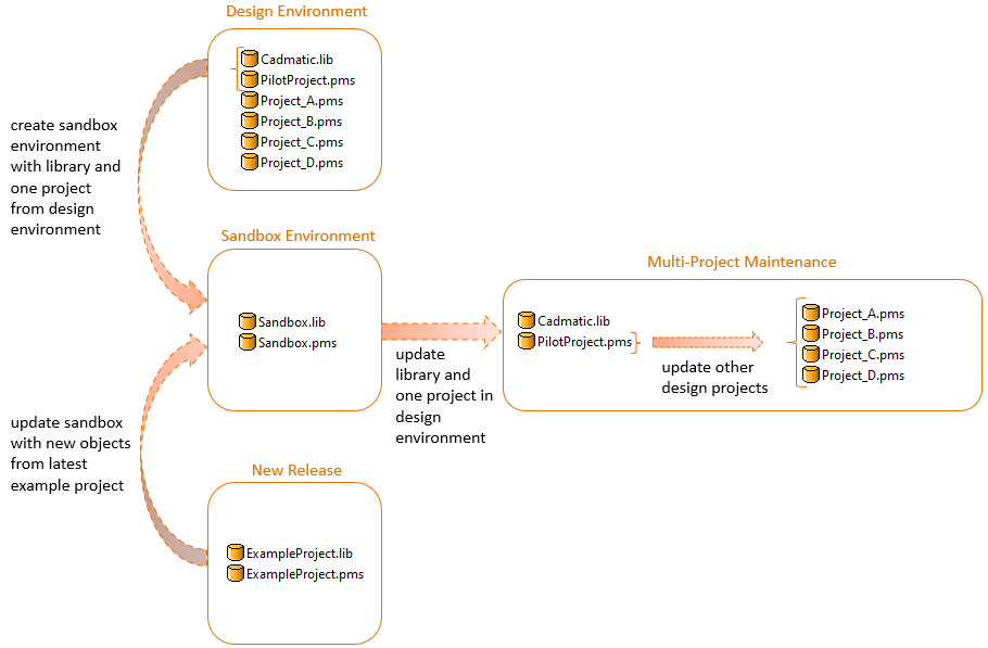 The Multi-Project Maintenance tool allows the project administrator to install a new CADMATIC release and add its new features to multiple on-going design projects at the same time. Using this tool, the administrator can prepare the required changes in an offline copy ("sandbox project") of an actual design project ("pilot project"), and then roll out the changes to all design projects ("target projects") as a single update action.