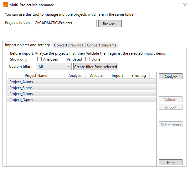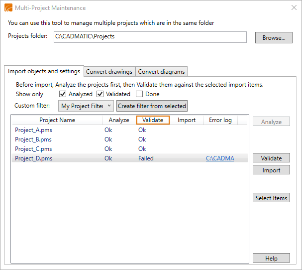 Use a custom filter or manual selection to indicate which projects you want to validate. You can validate the projects one at a time or all at the same time, as you wish.