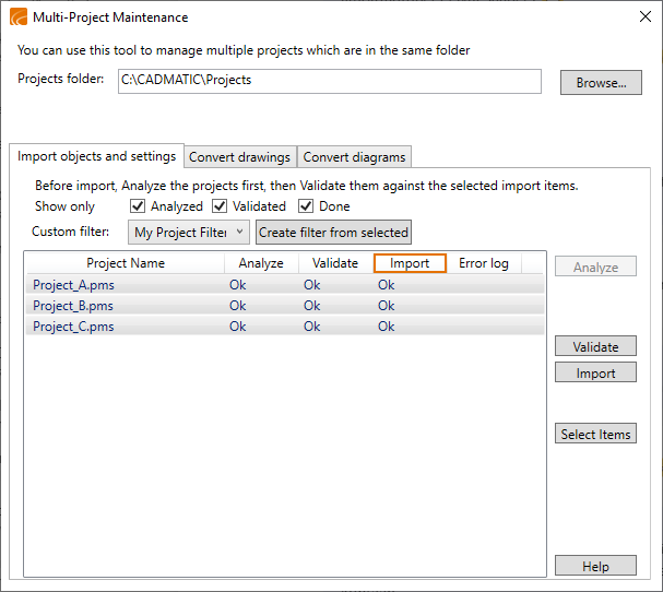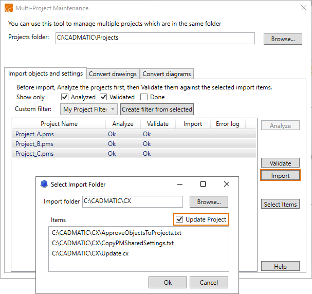 After validating the design projects, use the Multi-Project Maintenance tool to import the new data to the projects.