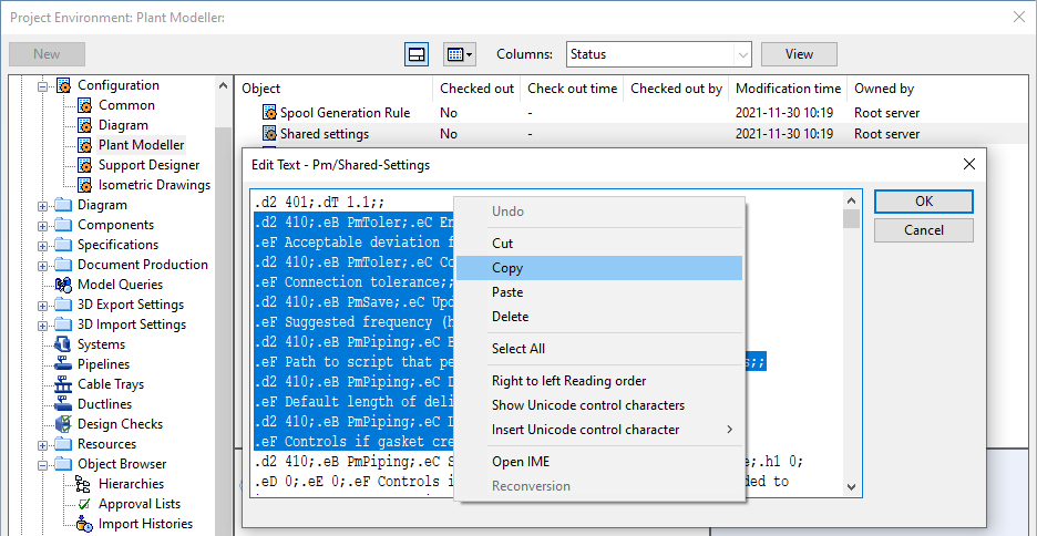 In the Project Environment dialog of the pilot project, browse to [project] > Configuration > Plant Modeller, right-click the "Shared settings" configuration object, and select Edit. The Edit Text dialog opens.