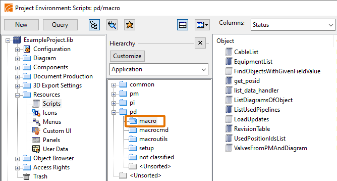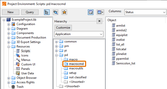 In the Project Environment dialog, [library] > Resources > Scripts > pd > macrocmd contains scripts that handle listings made from the P&ID application.