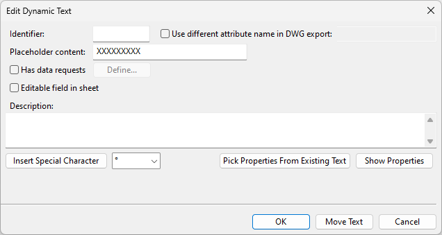 Optionally, enter a description to be shown in the Manage Dynamic Texts dialog. You can use the Insert Special Character tool to insert special characters into the description. |