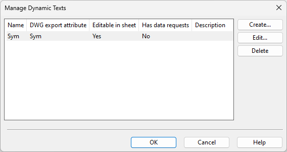 In the Block Editor tab > Insert group, select Dynamic Text > Manage dynamic texts. The Manage Dynamic Texts dialog opens, listing the dynamic texts of this block.