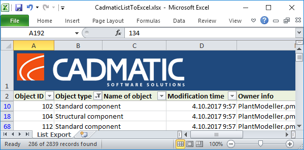 When a designer exports data from a list window to Microsoft Excel, the system automatically uses the custom template; in the resulting files, column headings are displayed in bold and the filter row allows data to be filtered by any column's contents: