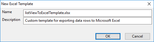 - In the New Excel Template dialog, make sure that template name is listViewToExcelTemplate.xlsx, type a description for the template, and click OK.