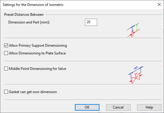 In the Settings for the Dimension of Isometric dialog, you can define the following settings for isometric drawings created in Piping Isometrics & Spools.