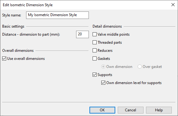 In the Edit Isometric Dimension Style dialog, you can define the following settings for isometric drawings created in Plant Modeller.