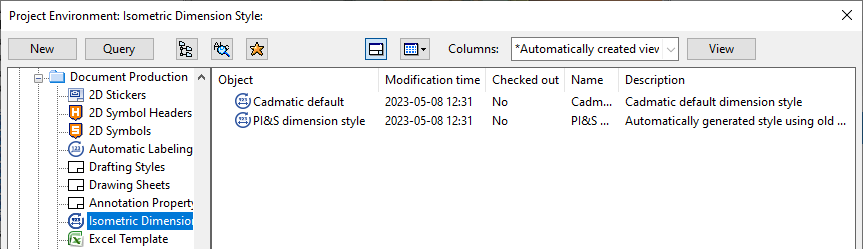 In the Project Environment dialog, in [library or project] > Document Production > Isometric Dimension Style, the project administrator can define an Isometric Dimension Style configuration, and then take the style into use by selecting it on the Main entities tab of the Automatic Annotation Settings dialog.