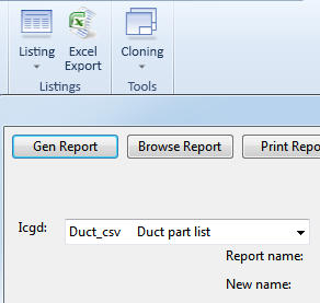 The CADMATIC example project contains a sample project report that uses shape dimensions for duct part. It can be found as an ICGD listing named Duct_csv. In Plant Modeller, the listing can be generated from Documents > Listing > Materials > Gen Report.