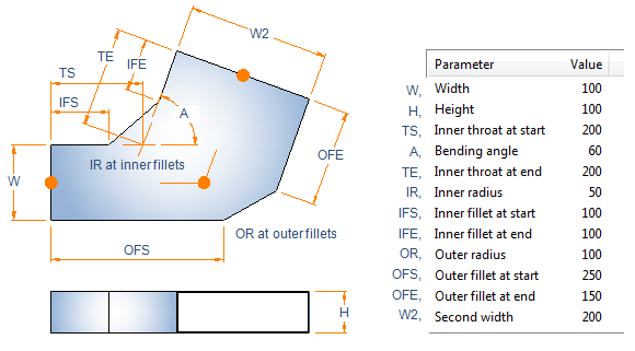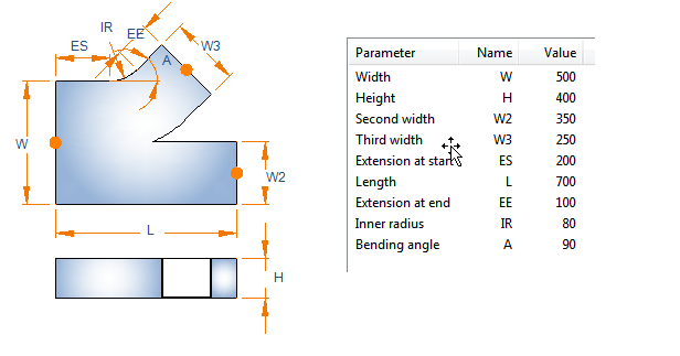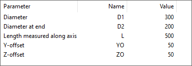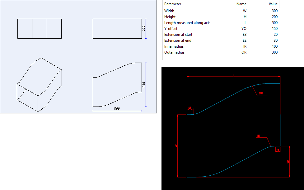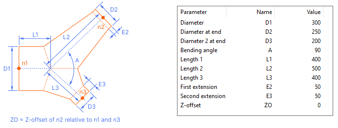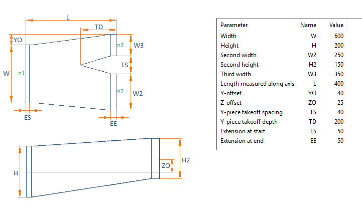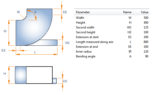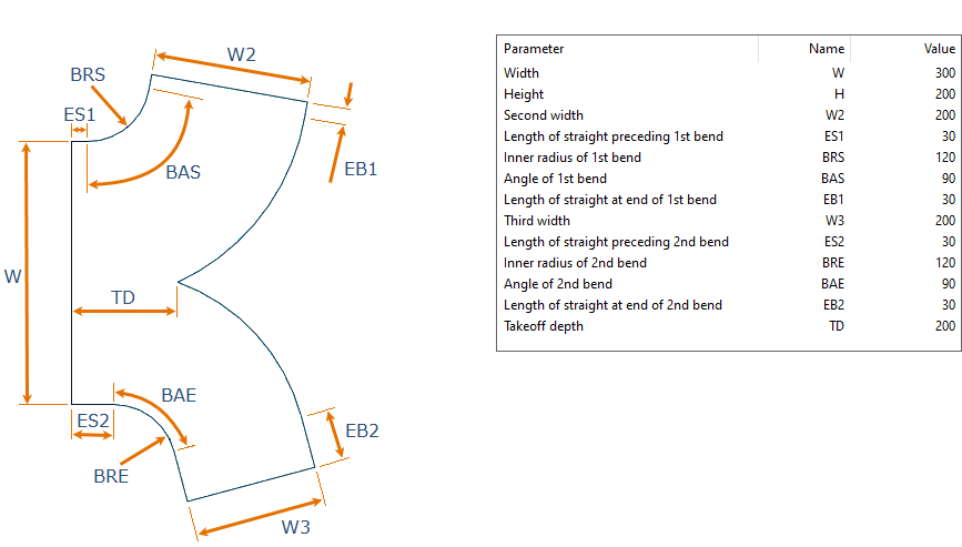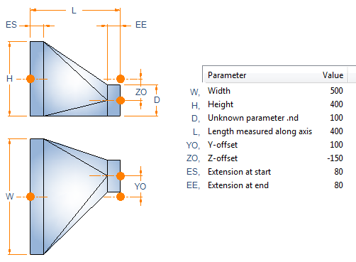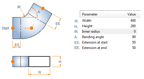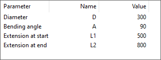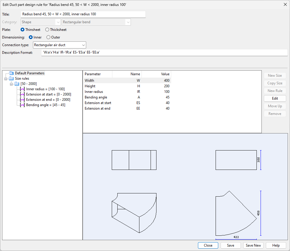 Description Format can refer to parameter values. Description tag can be used in lists and bill of material. Sometimes air duct parts can be ordered with shape name and parameter values only. For example, the description format for a bend 'W:a'x'H:a' IR-'IR:a' ES-'ES:a' EE-'EE:a' would result in Shape dimensions: 400x200 IR-100 ES-40 EE-40.