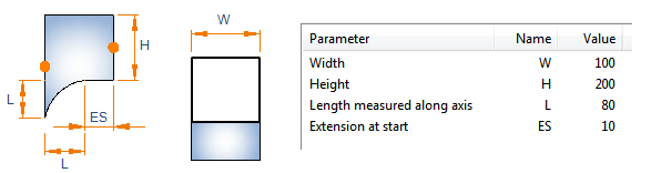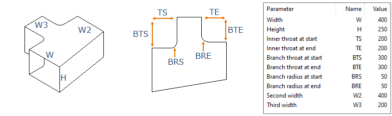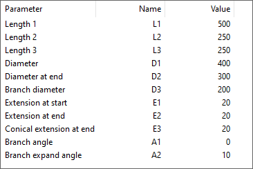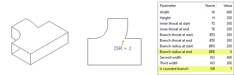 A rectangular branch can be turned into a rectangular rounded branch by setting the parameter Is rounded branch = 1. In this variant, Branch radius at end has no effect (can be left at 0), and the parameter is not shown when a designer is adding the component into the model.