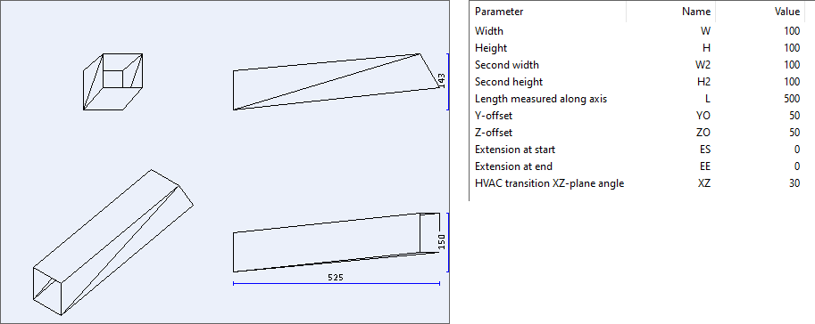 Design rules for prefabricated shapes allow project administrator to specify constraints for parameters that are passed to a given shape. For example, most shapes allow you to have some amount of straight parts at the beginning and the end, and in a duct part design rule you can force these lengths to be the same.