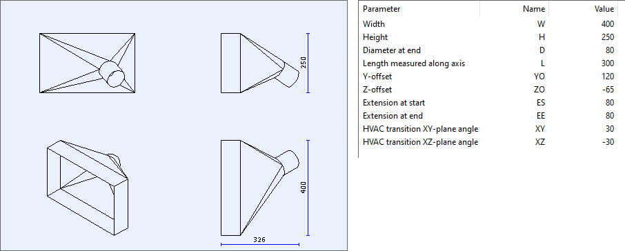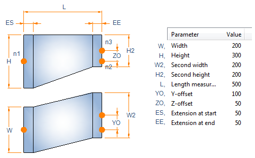 When the user is inserting the duct part, the Goto Point function calculates the offsets in local xy- and yz-planes and the user is prompted to choose which offset to use. If the user selects offset from yz-plane, the cross-section dimensions are swapped and the part is rotated to make the offset to be the y-offset.