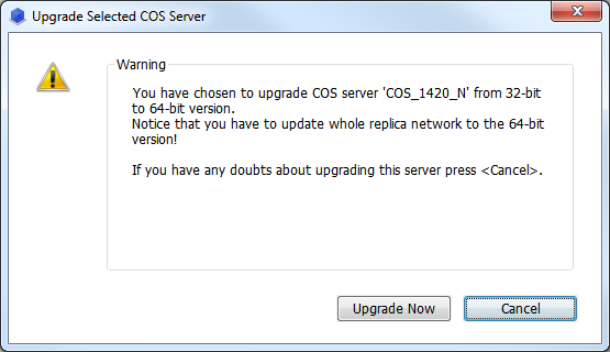If you are about to upgrade a 32-bit COS server to a 64-bit version a warning message appears. Don't proceed with the upgrade process unless you are sure about it: