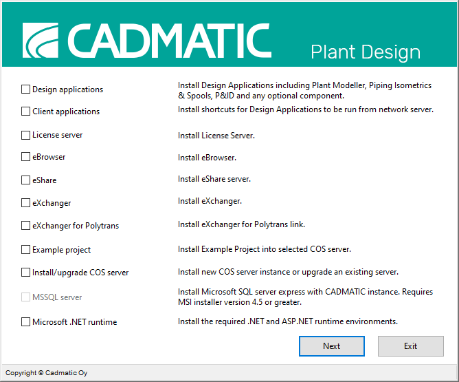 Install the program folders to your wanted server or workstation location (installation path is C:\Cadmatic\ by default) and follow the instructions on the installation media. New main version will be installed parallel with any existing version.