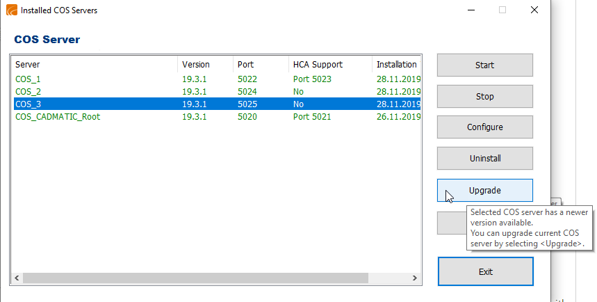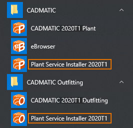 To upgrade a Plant Modeller Service, run the version-specific Plant Service Installer from your computer's Start > CADMATIC or Start > CADMATIC Outfitting menu.