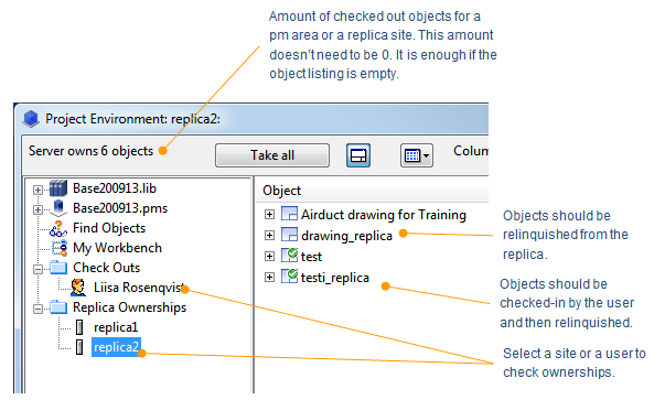 At the master site, open Library and Project Databases and check that all relevant objects are checked in by replica. DO NOT Force cancel check-out or Take All. Objects that are always left at replica site are Plant Modeller areas and replica sites.