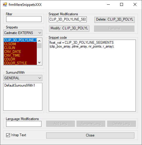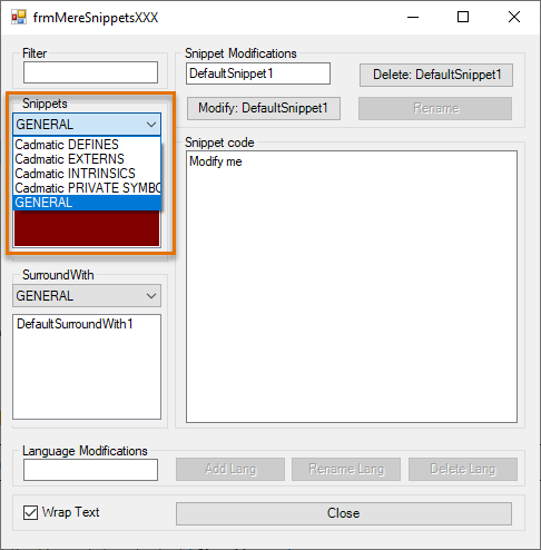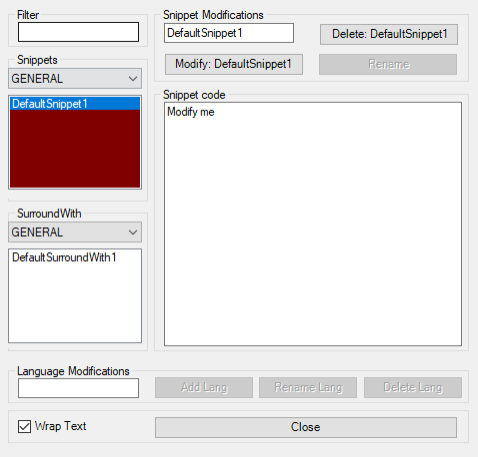 2. Enter snippet details, snippet code, and possible language modifications. Click Close.