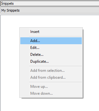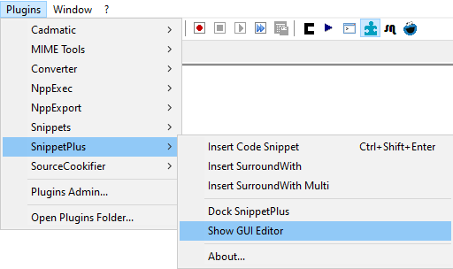 1. To open snippet editor, select Plugins > SnippetPlus > Show GUI Editor.