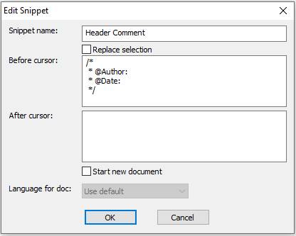 2. Add the snippet details including name, before and after cursor details. Click OK.