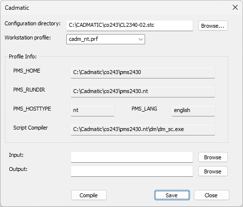 • Input – Select the CADMATIC script file (.mac, .asy) to be compiled.