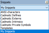 • Insert defines, externs, private symbols etc. via code snippet panel