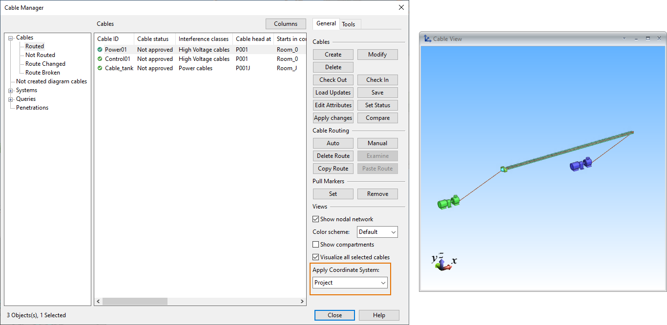 The Cable List pane and the Cable Manager tool can only be opened in an area that covers the entire project space. In practice, this means that only areas that use the Project coordinate system instead of a local coordinate system can be used to manage cables.