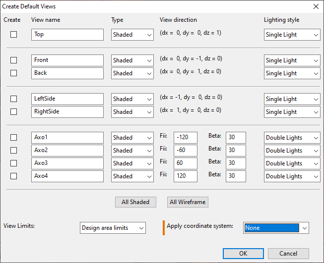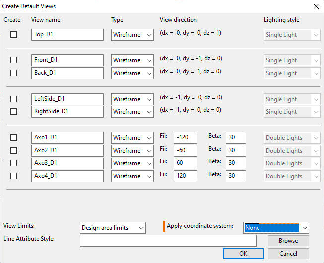 By default, the work views in Plant Modeller use the coordinate system of the area. However, when creating a new work view, the user can apply specific coordinate system transformation to it by selecting one of the available coordinate systems. This allows the new view to show the objects using the perspective (viewpoint, view direction, and up-vector) of the specified coordinate system.