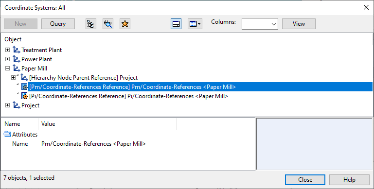 If the project has been created in an older CADMATIC version that did not support local coordinates, any model objects that existed before the version upgrade do not have an explicit reference to a coordinate system, but implicitly belong to the Project coordinate system. If they should belong to a local coordinate system, the user can move them in Plant Modeller as described in Change coordinate system.