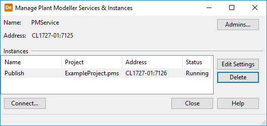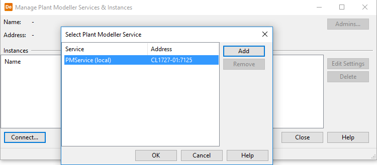 In the Manage Plant Modeller Services & Instances dialog, click Connect and connect to the service that contains the Service Instance.