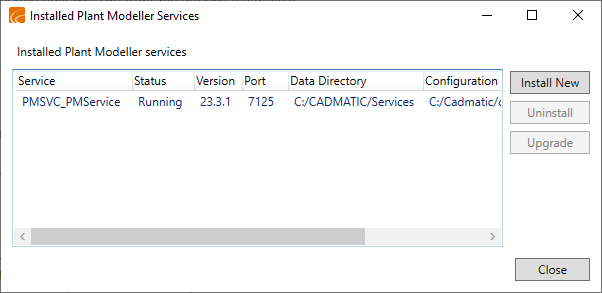 In the Start menu of Windows, select CADMATIC > Plant Service Installer [version]. The Installed Plant Modeller Services dialog opens, listing the Plant Modeller Services that are installed on the local computer.