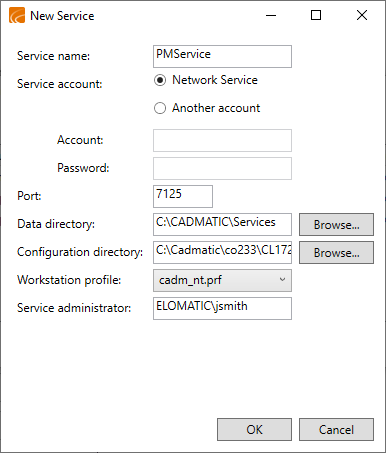 Workstation profile – This is the workstation profile (cadm_nt.prf in the specified configuration directory) that the service will use. This profile should point to the local installation of CADMATIC.