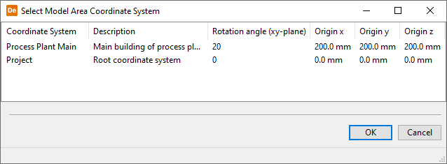 If project administrator has defined custom coordinate systems, the Select Model Area Coordinate System dialog opens. Select which coordinate system the Service Instance is to use ("Project" is the default coordinate system), and click OK.