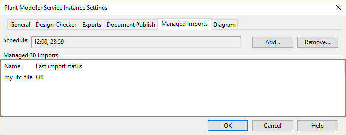 On the Managed Imports tab, you can schedule importing of 3D model data from files that have been attached to 3D-Import Manager at the project site where the Service Instance is located.
