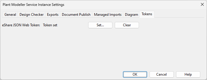 On the Tokens tab, you can assign a JSON Web Token (JWT) to the Plant Modeller Service Instance. This might be necessary to enable the Service Instance to export 3D models and documents to CADMATIC eShare.