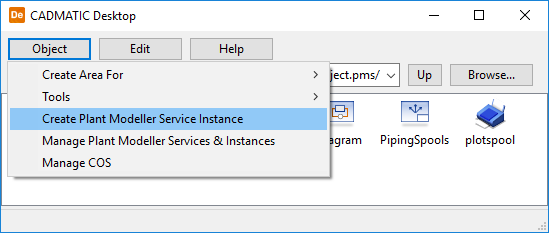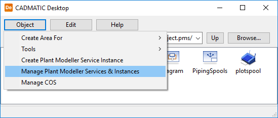 In the CADMATIC desktop, select Object > Manage Plant Modeller Services & Instances.