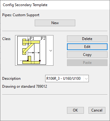 Example of selecting a template for building a secondary support, using the associated build script and the project-specific parameters of the parameter set whose description is "R106R_3 - U160/U100":