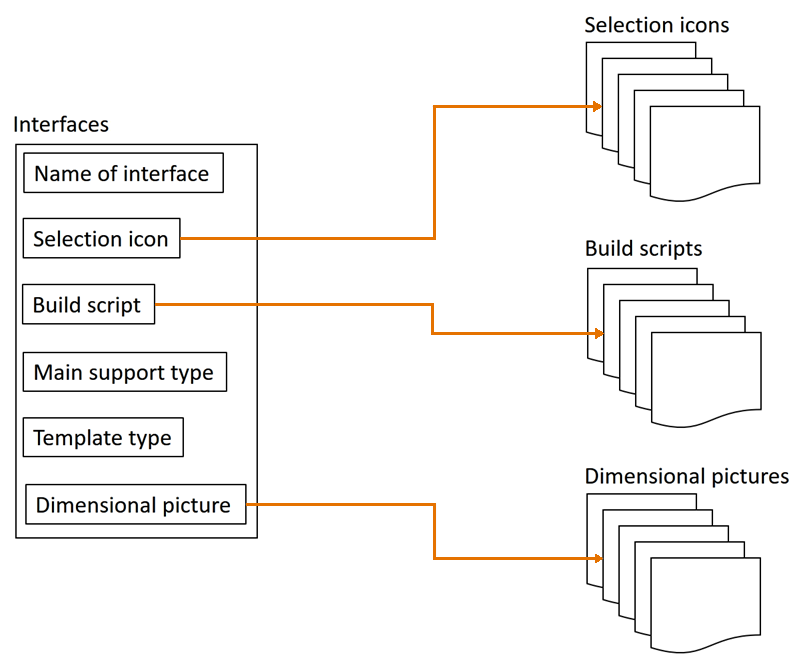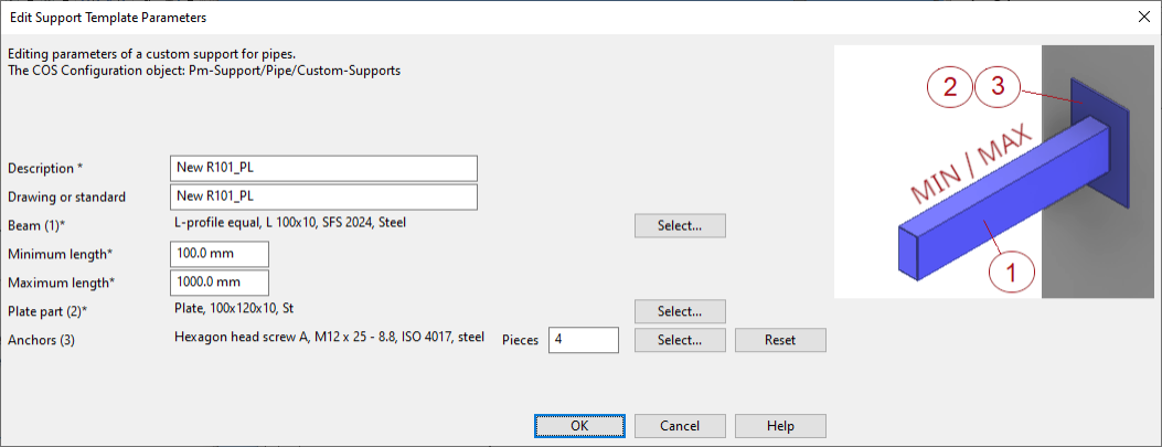 The purpose of the dimensional picture of the interface is to show what the project-specific parameters refer to. The bitmap picture is shown when editing a record of a Support Designer configuration object.