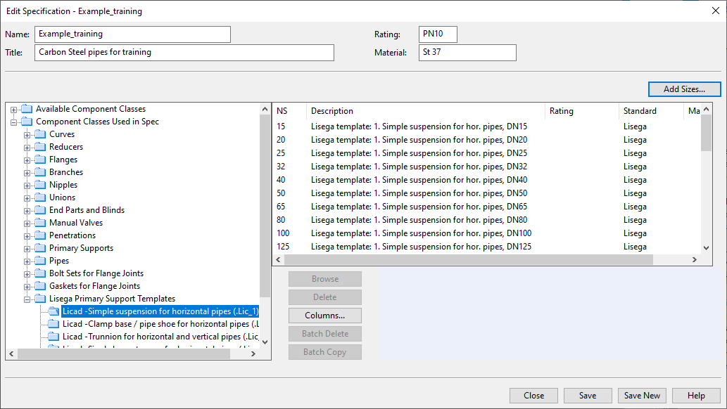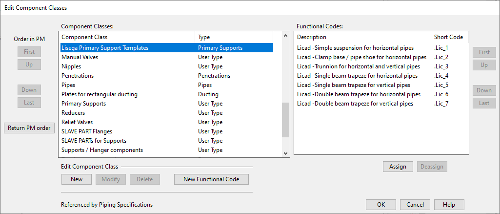 2. Check that [project] > Configuration > Common > Component classes contains the component class "Lisega Primary Support Templates" and that it references the LICAD functional codes. Add the setup if it is missing.