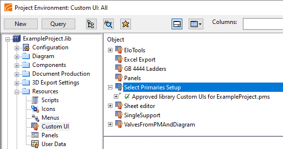 You can modify the Custom UI object if needed. You must open the Project Environment dialog from the CADMATIC desktop, and after saving the changes you must restart Plant Modeller if it was open during the editing.