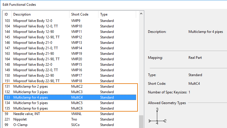 There must be a separate Functional Description and Short Code for each multi-clamp where the number of supported pipes is different. In the example below, there are separate Functional Descriptions and Short Codes for clamps for 2, 3, 4, 5 and 6 pipes.