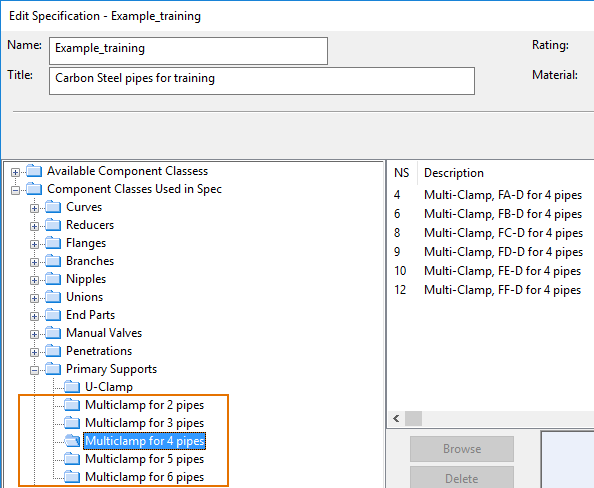Notice that you need to have components for these Functional Codes in the Piping Specifications of the real pipelines which are supported using multi-clamps, as well as in the Piping Specification of the so-called Secondary Support Pipeline.