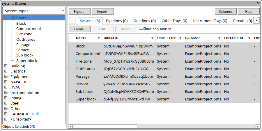 In the left pane of the Systems and Lines dialog, select what to export: