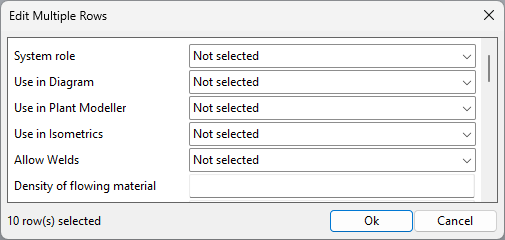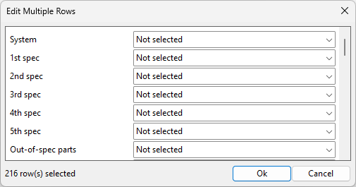 If editing multiple lines, the Edit Multiple Rows dialog opens, displaying the editable fields that the lines have in common. Initially, all fields show either 'Not selected' or an empty value. This indicates that they will maintain their current value unless you input a new one. Accordingly, select or type a new value in the fields where you want to change the value for all selected lines. Note that you will only be able to undo these changes by manually restoring the values. Then click Ok.