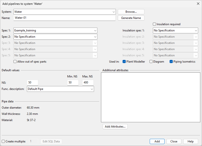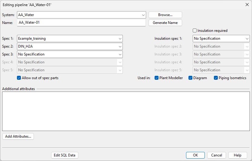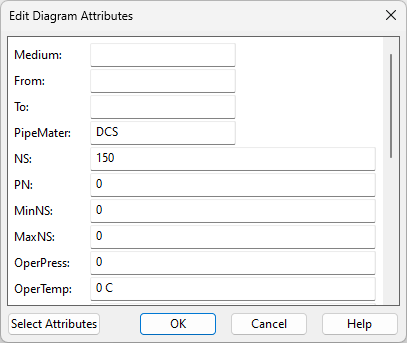 In this dialog, you can edit the pipeline specific attributes that are stored in the SQL database of P&ID.