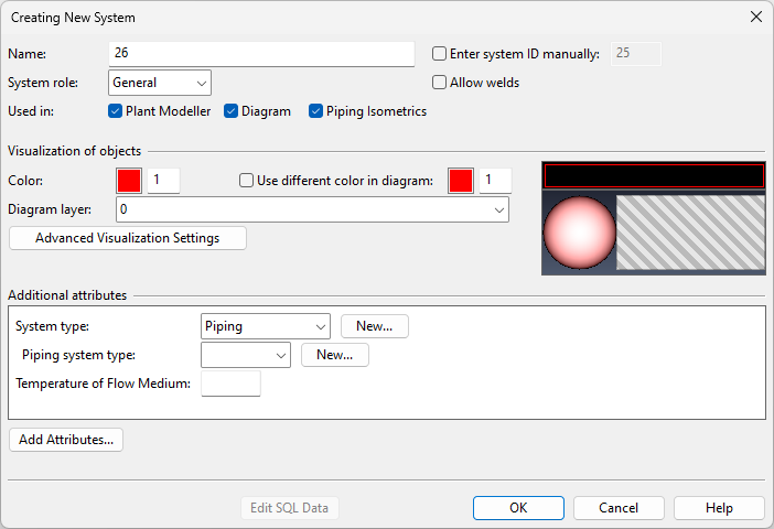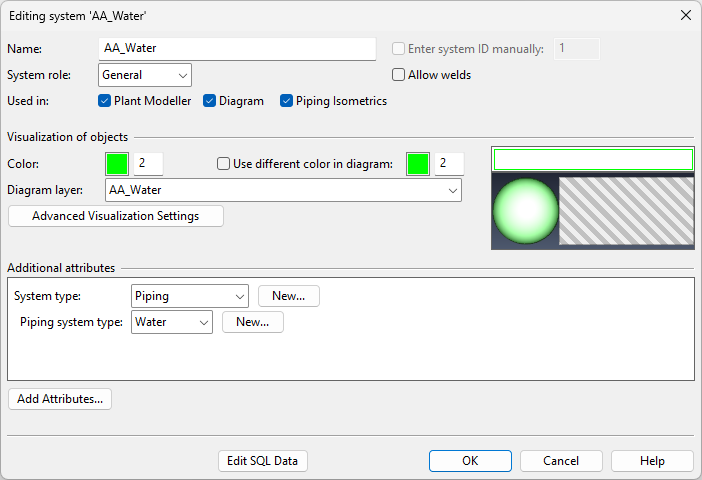 If selected, the system is visible in P&ID, and you can define the options Use different color in diagram and Diagram layer.
