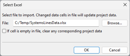 In the Systems and Lines dialog, click Import. The Select Excel dialog opens.