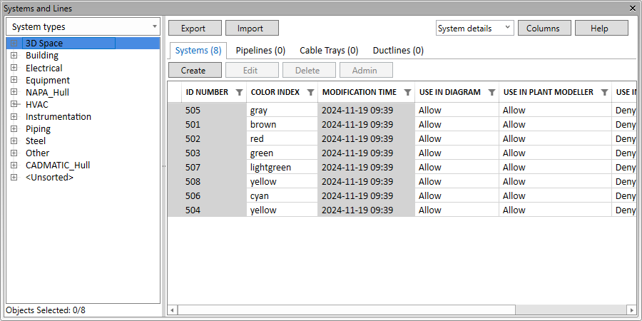 When opened from Plant Modeller, the dialog allows managing Systems, Pipelines, Cable Trays, and Ductlines.